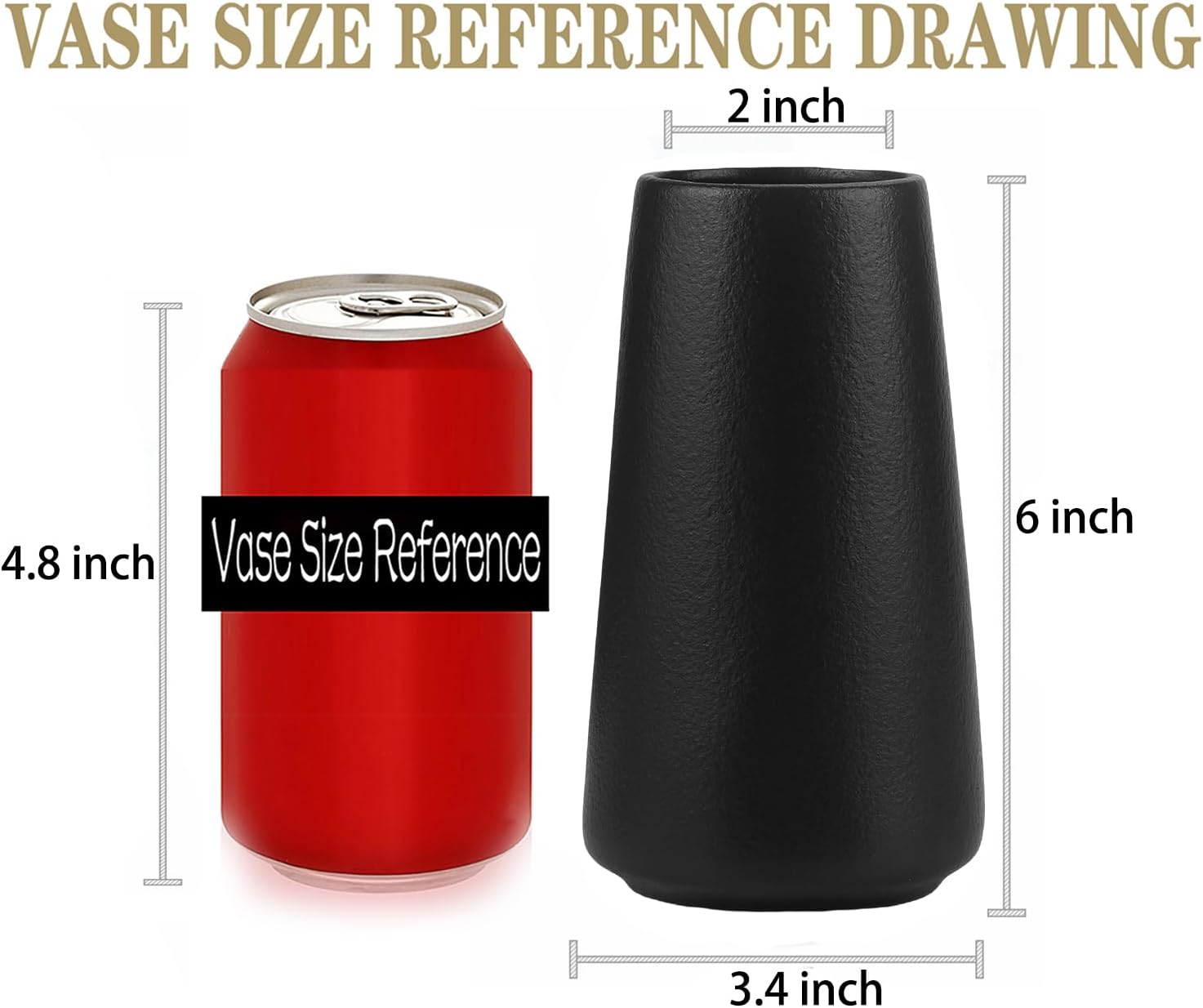 - Vase size: (6"H x 3.4"W base) with 2" opening. This decorative ceramic vase is about 6 inches tall, 2 inches in diameter at the top and 3.4 inches at the bottom. Perfect for supermarket bouquets or 11-20" artificial stems.