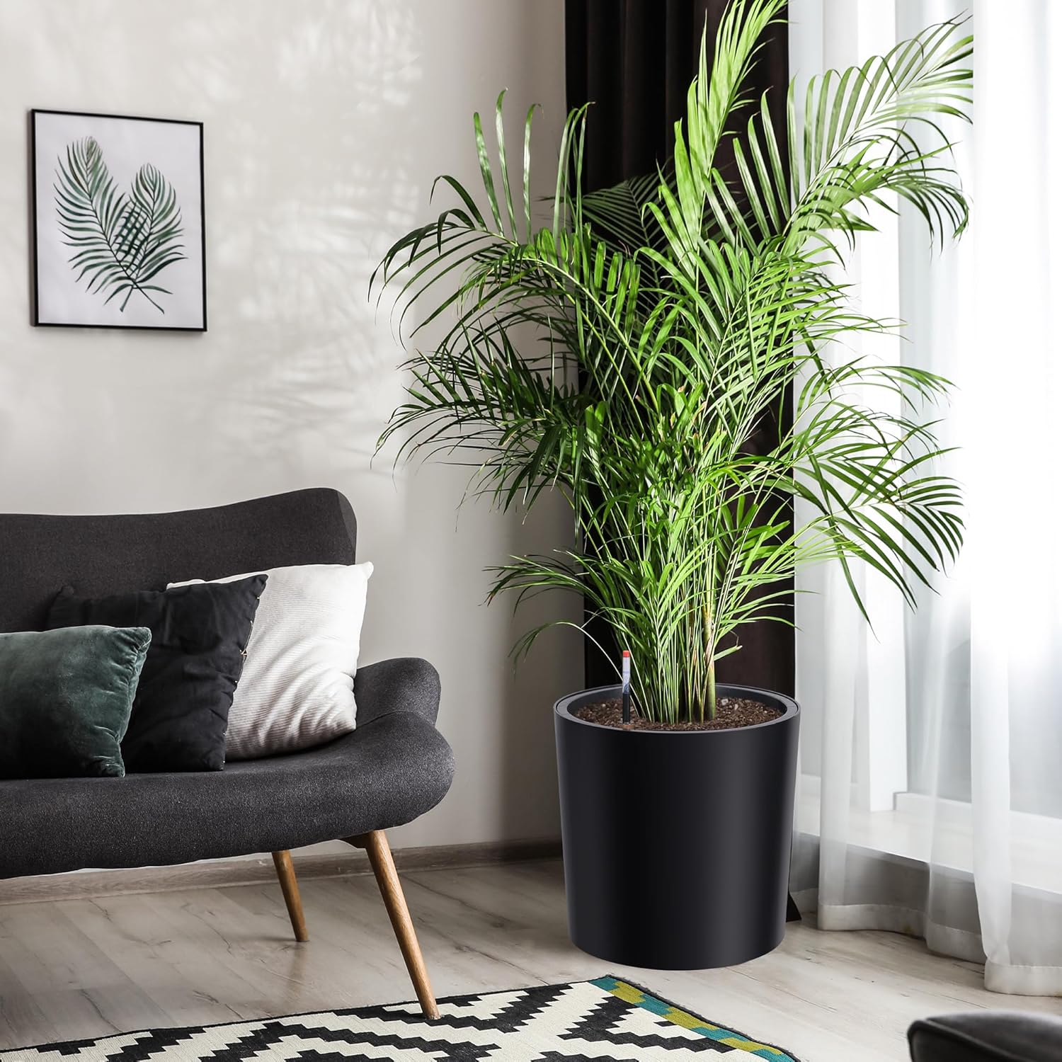 Tall Round Planter Set of 2, 19.5‘’ H x 19.9" Dia Large Planters for Indoor Plants with Built-in Drainage and a Water Level Monitor and Wheels for Patio, Porch, Living Room, or Home Office, Black